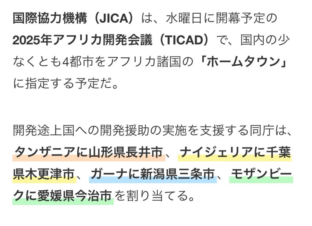 国際協力機構(JICA)は、指定されたアフリカ4カ国の専用「ホームタウン」として、アジアの島で少なくとも4つの自治体を指定するために動いている。