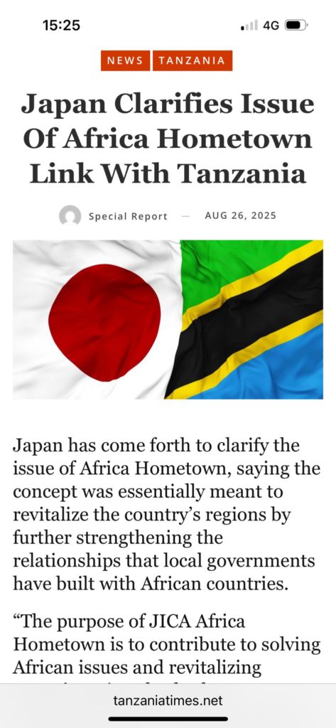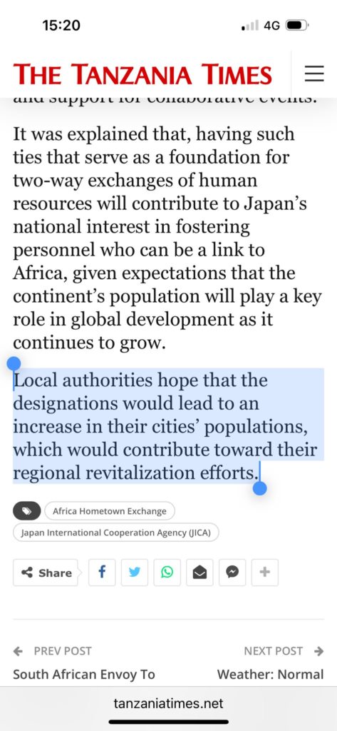 Tanzania Times 日本側はホームタウン計画の問題を明確にし、計画続行と人口増に繋がる事を期待している…