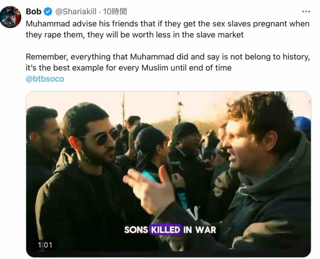 ムハンマドは友人たちに、性奴隷をレイプして妊娠させた場合、奴隷市場での価値が下がると助言した。 ムハンマドが行い、言ったことは過去だけでなく、時の終わりまで全ムスリムの模範である。