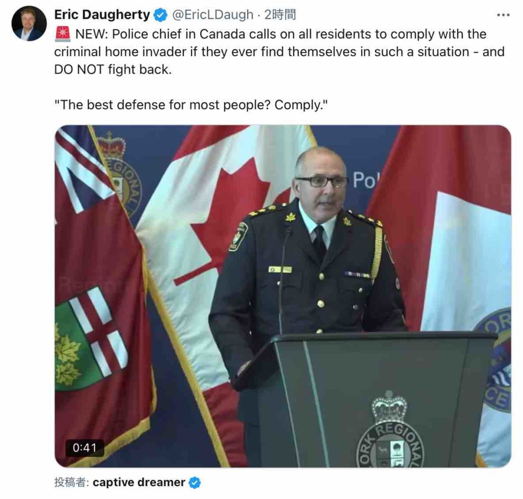 カナダの警察署長が、すべての住民に対し、そのような状況に陥った場合、犯罪者の住宅侵入者に従うよう呼びかけ、絶対に抵抗しないようにと述べています。 「ほとんどの人にとって最善の防御? 従うことです。」