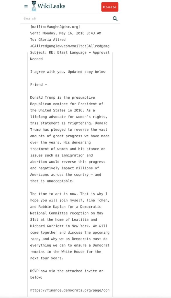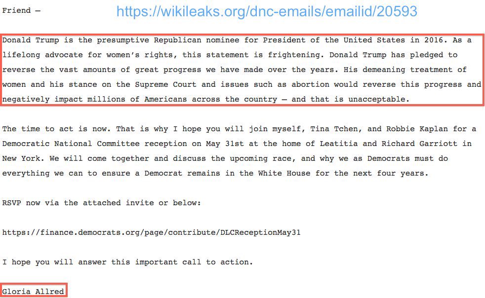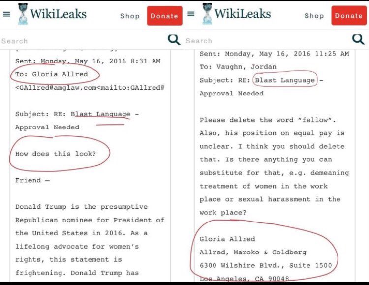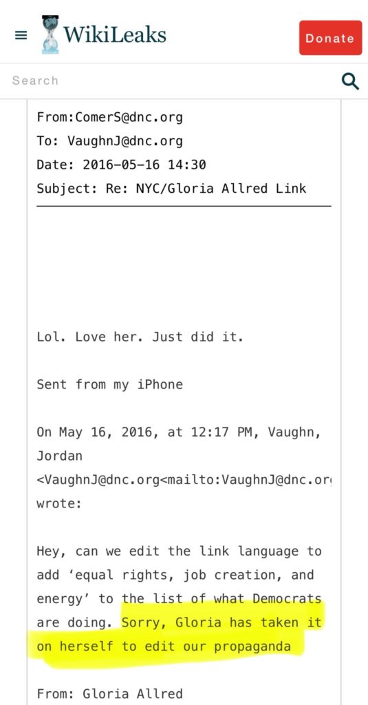 グロリア・オールレッドは、ヒラリー・クリントンの工作員として知られており、トランプ大統領に対して虚偽の性的暴行の主張をする女性たちを動員し、報酬を支払ったとされています。 ウィキリークスによって公開されたDNCのメールは、彼女がクリントンの工作員であることを証明しています。彼女はヒラリーのための資金集めを行い、2016年のDNC大会でヒラリーの代議員を務め、リークされたメールでは、DNCのスタッフが驚くべきことにグロリアが「我々のプロパガンダを編集する」役割を自ら担っていると書いています。