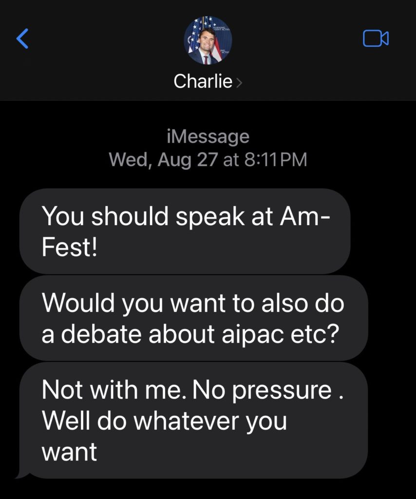 彼はAIPACについて討論したいかと尋ねましたが、彼自身と対決するのではないと明確にしました。 彼は「我々」、つまり彼とTPUSAが、この問題について私が望むことは何でもすると言いました。 ビビ・ネタニヤフ(外国の指導者)とチャーリーの個人的な友人であるキャンディス・オーウェンズやタッカー・カールソン、どちらを信じるべきか分からない場合、私はチャーリー最後のテキストメッセージを公開します。