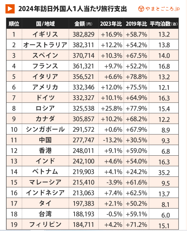 これを見ればインバウンド推進するなら、どこの国からの客を増やすべきかは分かるはず。そして、中国からの客が減っても怖くない。むしろ、欧米客用の宿泊場所が空いてよい。高安カミユ