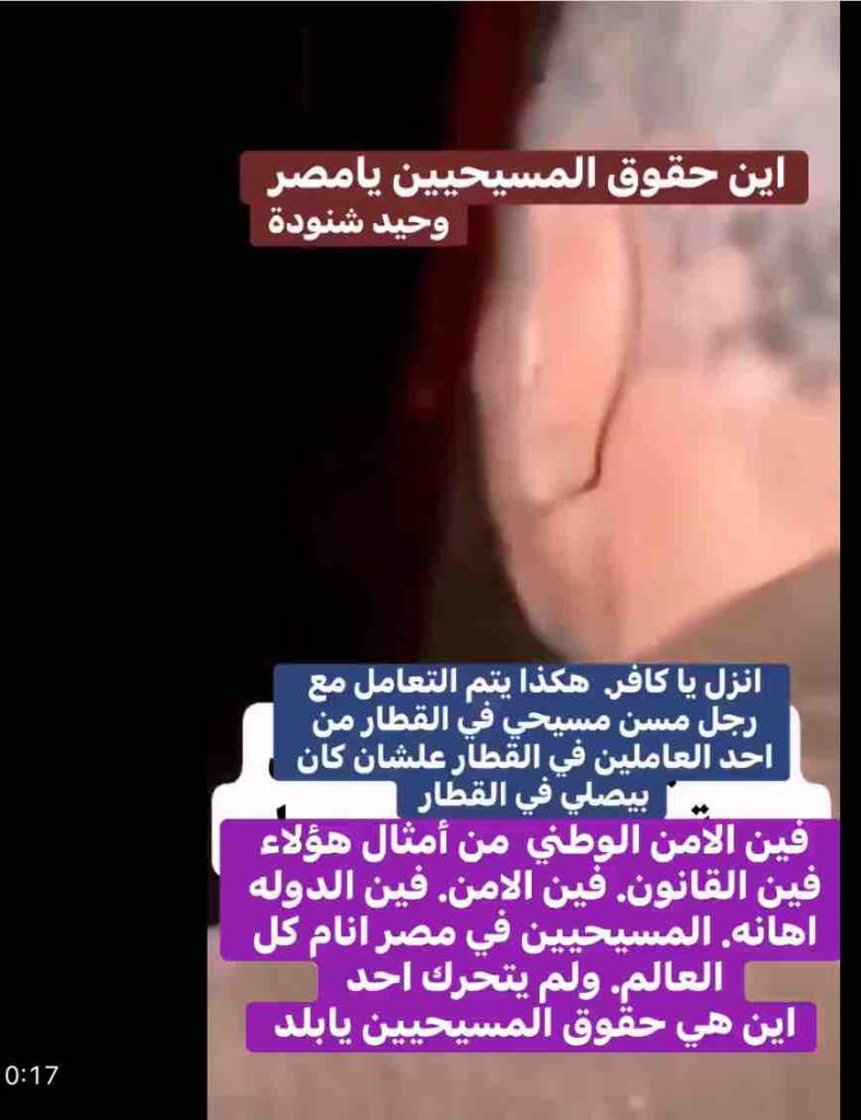 エジプトで、年配のコプト正教会のキリスト教徒の男性が、ムスリム乗客たちがキリスト教徒の近くにいたくないために、列車から強制的に降ろされました。