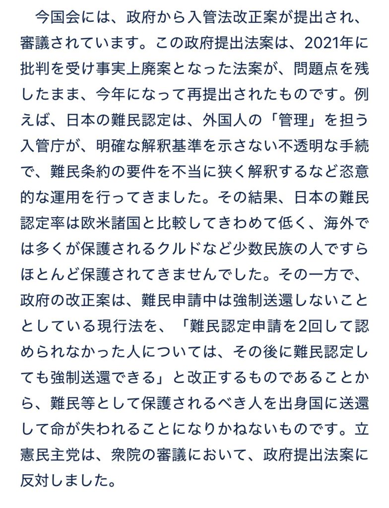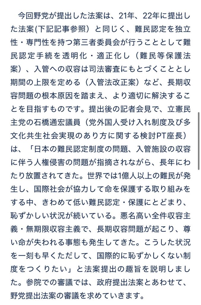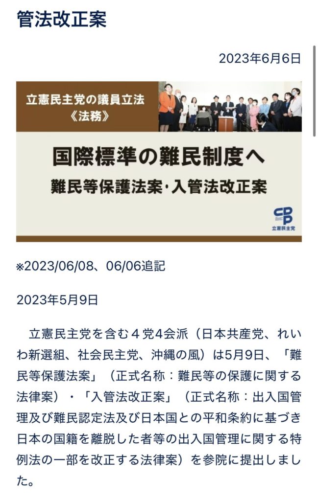 2年前、立憲が共産・れいわ・社民と提出した入管法対案はこちら。 https://cdp-japan.jp/news/20230509_6013/amp 何度でも家族帯同の難民申請ができ、その間の生活費は全て日本国民の税金で工面するというトンデモ法案を出していたのが立憲民主党。 彼らに政権を委ねれば日本が日本で無くなることがよくわかります。梅村みずほ