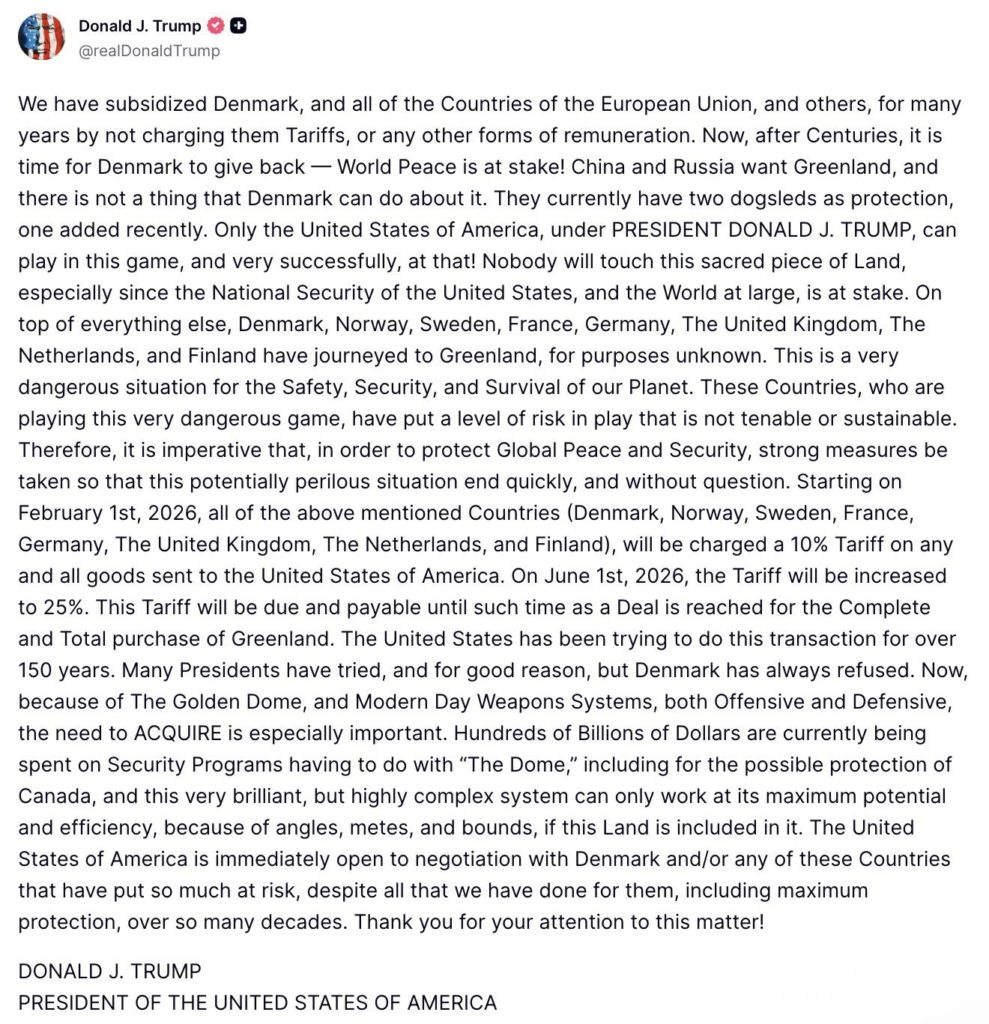 関税は、米国がグリーンランド購入の合意に達するまで有効となります。 「デンマークが返す時が来ました」とトランプは述べました。