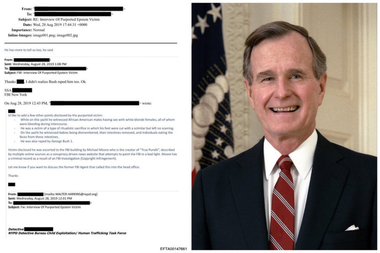 ジョージ・H・W・ブッシュが男性の被害者をレイプしたと主張されており、同じ被害者がまた、儀式的な生贄として剣で足を切り落とされる目に遭わされたとされている。
