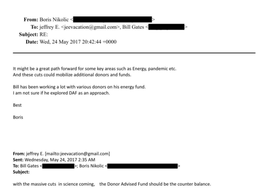 2017年5月(COVID-19の3年前)、ビル・ゲイツの科学技術首席顧問ボリス・ニコリッチがエプスタインとゲイツにメール: