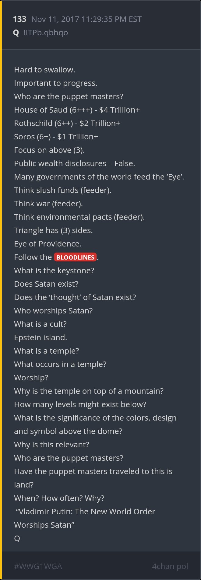 - 初回公開分が衝撃的だったのに対し、今回分はさらに深刻で、サタニズム、悪魔崇拝、遺伝子工学、子供からの幹細胞抽出などが暴露。