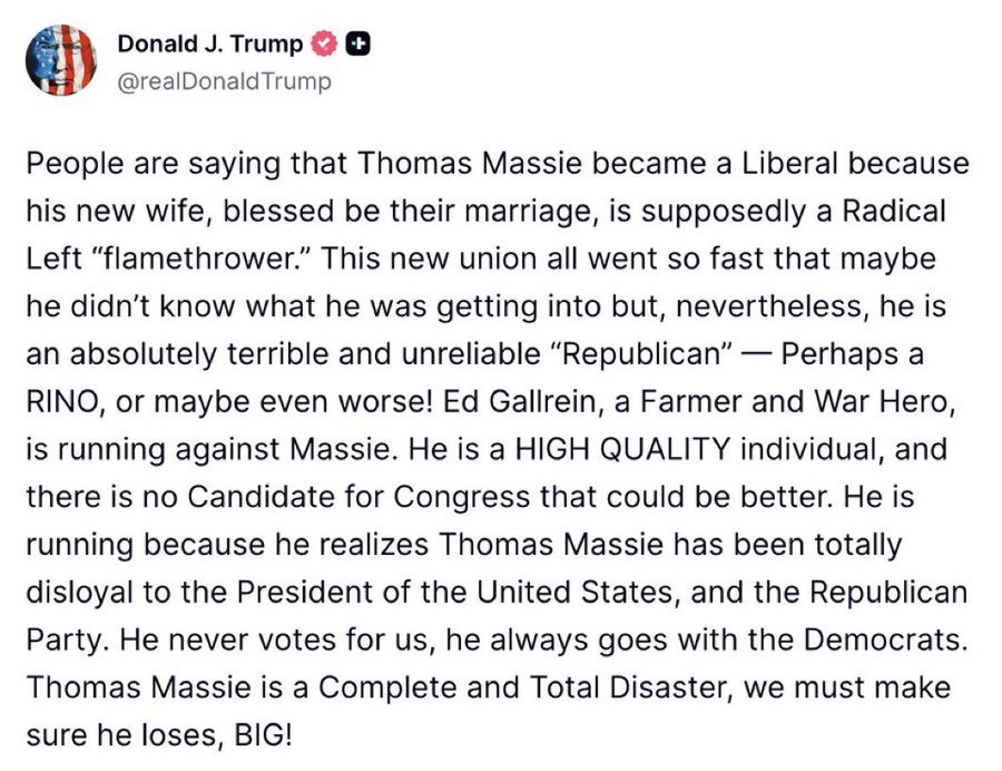 トランプ:「人々は、トーマス・マッシーがリベラルになったのは、祝福されるべき結婚ではあるが、 彼の新しい妻が“過激左派の火炎放射器”だとされているからだと言っている。 この新しい結婚はあまりにも急だったので、彼は自分が何に巻き込まれているのか分かっていなかったのかもしれない。