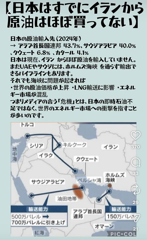 日本はすでにホルムズ海峡を通過しない石油ルートを持っており、在庫も安い時期に仕入れたものだそうです。 それなのに高値で売られるのは「便乗値上げ」に他なりません。 皆さんが知れば世論が変わり、反論も可能になります。ぜひ拡散して備えを強めましょう。