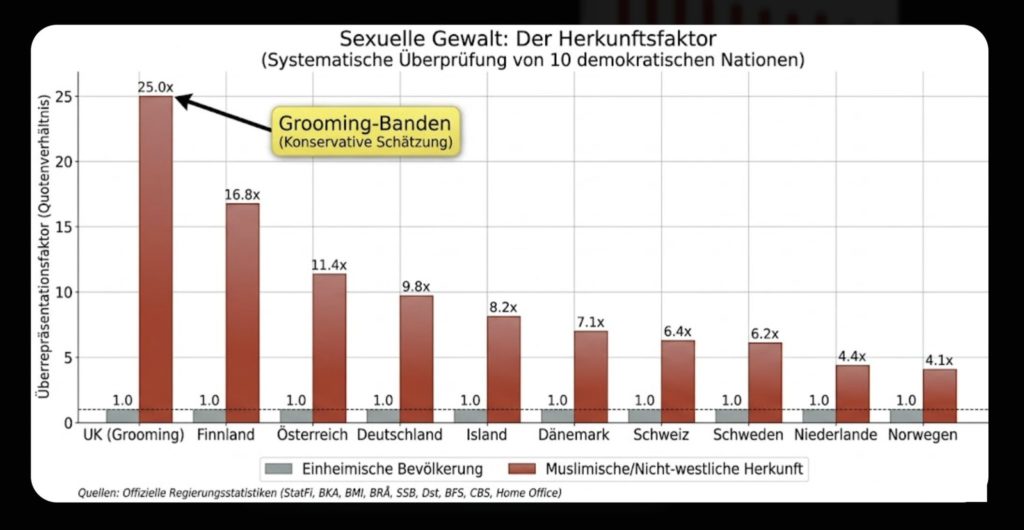 ムスリム背景を持つ人々は、典型的には地元人口に比べて性的犯罪の加害者として4~17倍頻繁に該当します。