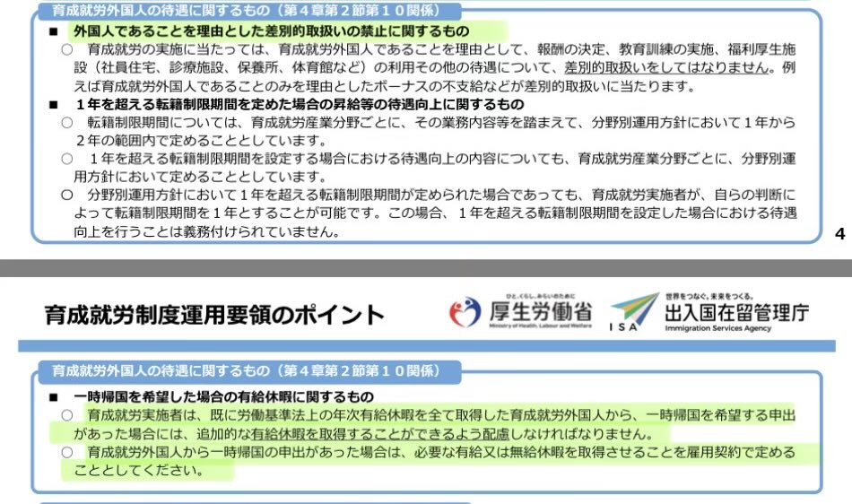 これおかしくない? “年次有給休暇を全て取得しても育成就労外国人が一時帰国を希望する場合は、追加的な有給休暇が取れるよう配慮しなければならない” 特定技能制度も基本的に同じルールのようです。 日本人が帰省する場合は追加で有給休暇くれませんよ。 差別してはいけないって、これじゃ日本人差別じゃないの? 出入国在留管理庁「育成就労制度運用のポイント」より
